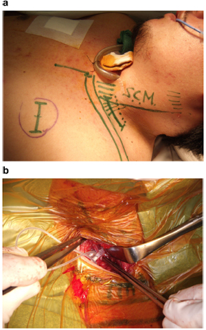 A linear, horizontal skin incision is made and the sternocleidomastoid muscle is retracted medially. The phrenic nerve is identified