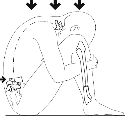 Fig. 1. Schematic of the mechanism and pattern of injury. The large arrows indicate the high-energy, low-velocity downward force causing hyperflexion of the spinal column, while the small arrow indicates L4/5 dislocation. The atlantoaxial injury and lower limb fractures are also shown.